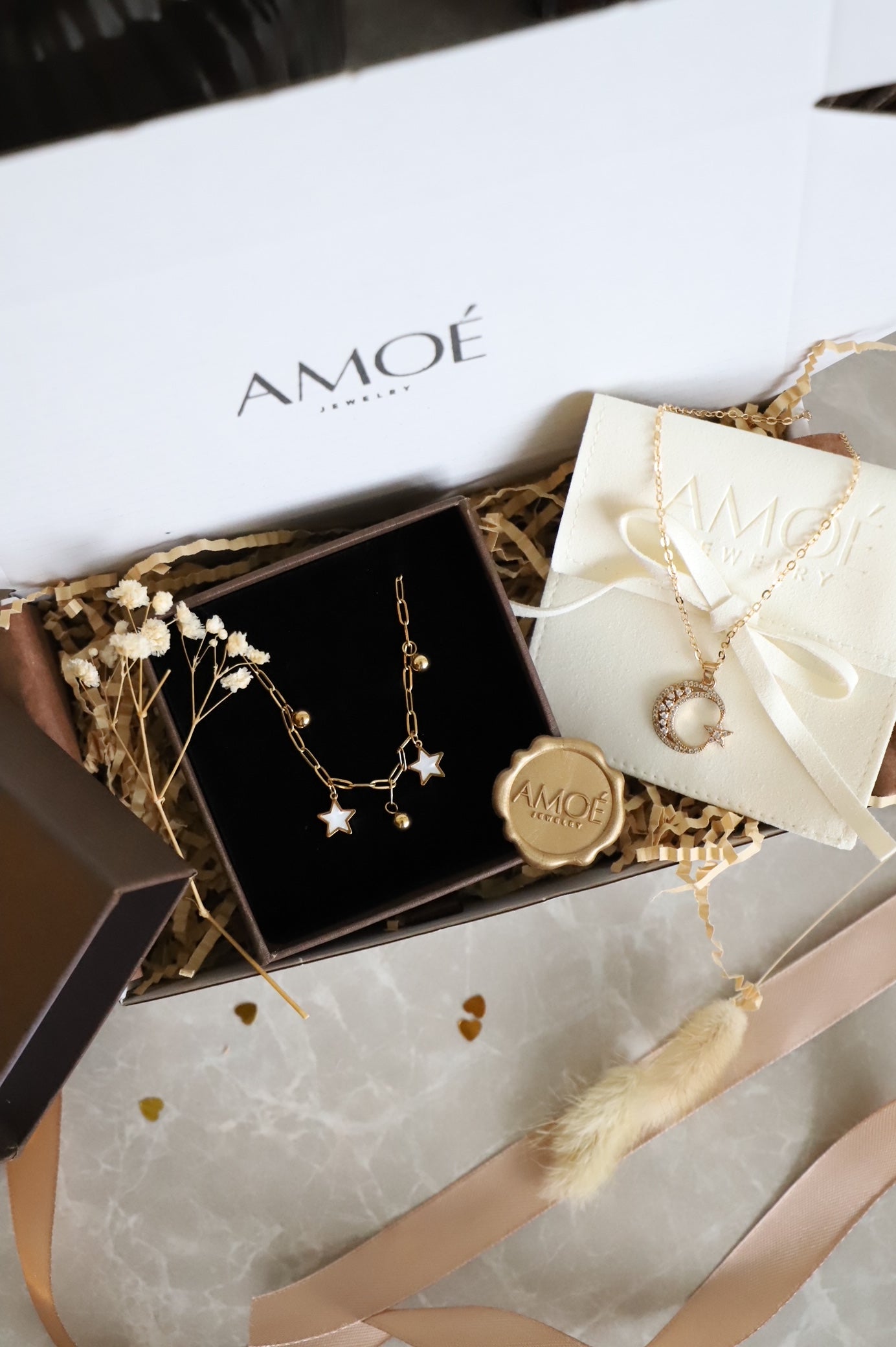 Jedes Schmuckstück wird sorgfältig in einer eleganten Box verpackt und mit deinem persönlichen AMOÉ Self-Love Brief ergänzt – perfekt zum Verschenken oder selbst behalten.